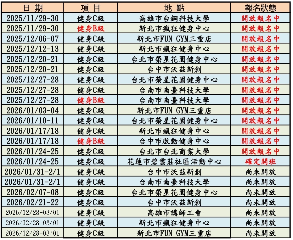 115年度預定場次其中包括:國際認證(IPTFA)、B級認證、C級認證、樂齡認證特殊專長認證等。